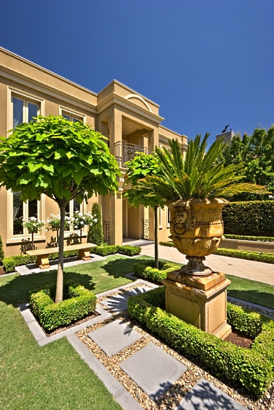 pool, inviting entertaining area, elegant statues and formal planting,